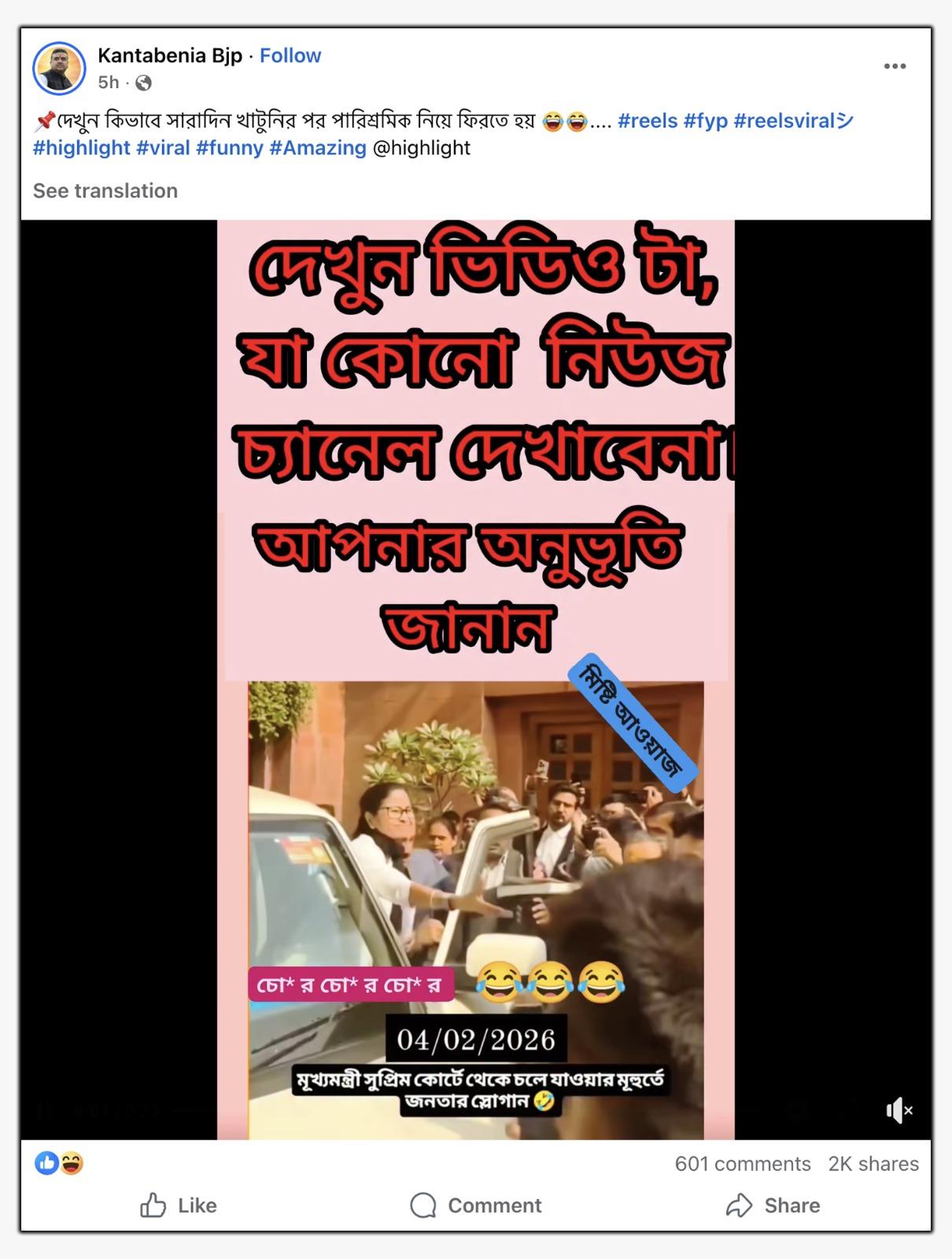 ভিডিওতে দেখা যাচ্ছে, মমতা বন্দ্যোপাধ্যায় আইনজীবীদের দ্বারা পরিবেষ্টিত অবস্থায় গাড়িতে ওঠার চেষ্টা করছেন। সেই সময় চারপাশে ‘চোর চোর’ স্লোগান ভেসে আসছে। ভিডিওটি পোস্ট করে এর উপর লেখা হয়েছে, “দেখুন ভিডিও টা, যা কোনো নিউজ চ্যানেল দেখাবেনা আপনার অনুভূতি জানান। মিষ্টি আওয়াজ। চোর চোর চোর। 04/02/2026। মূখ্যমন্ত্রী সুপ্রিম কোর্টে থেকে চলে যাওয়ার মূহুর্তে জনতার স্লোগান।”