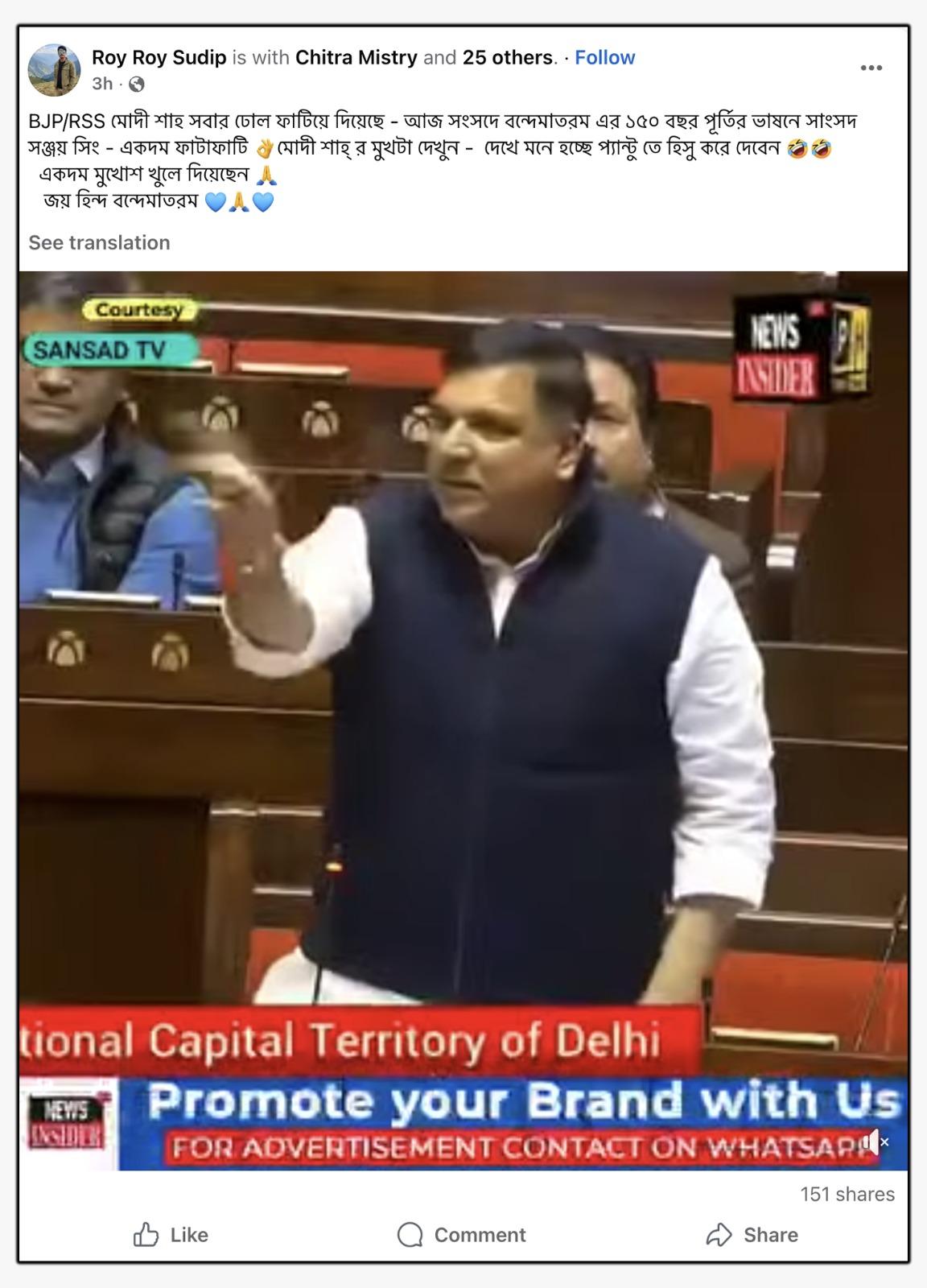 ভিডিওটি পোস্ট করে ক্যাপশনে লেখা হয়েছে, “BJP/RSS মোদী শাহ সবার ঢোল ফাটিয়ে দিয়েছে - আজ সংসদে বন্দেমাতরম এর ১৫০ বছর পূর্তির ভাষনে সাংসদ সঞ্জয় সিং - একদম ফাটাফাটি 👌মোদী শাহ্ র মুখটা দেখুন - দেখে মনে হচ্ছে প্যান্টু তে ** করে দেবেন। একদম মুখোশ খুলে দিয়েছেন।”