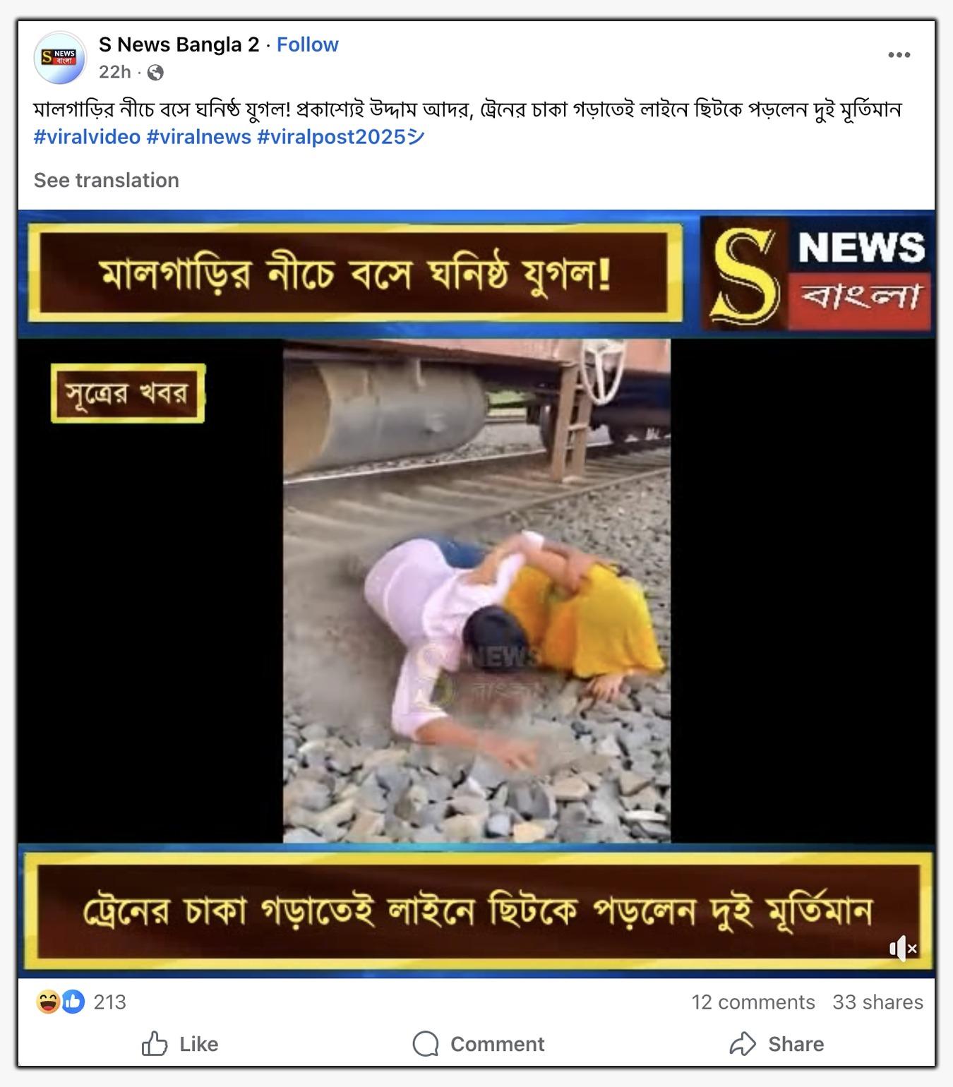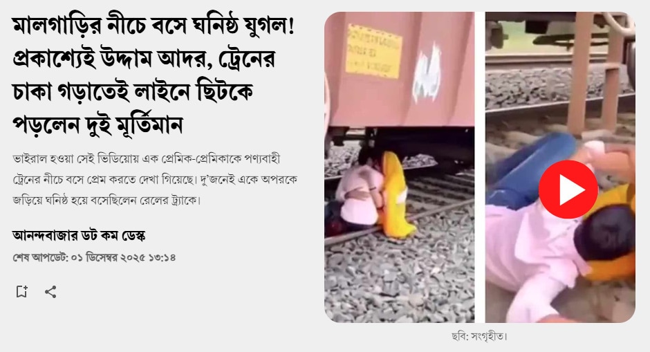 ভিডিওটি সোশ্যাল মিডিয়ায় পোস্ট করে বেশ কয়েকটি ফেসবুক পেজ থেকে ক্যাপশনে লেখা হয়েছে, “মালগাড়ির নীচে বসে ঘনিষ্ঠ যুগল! প্রকাশ্যেই উদ্দাম আদর, ট্রেনের চাকা গড়াতেই লাইনে ছিটকে পড়লেন দুই মূর্তিমান।”
