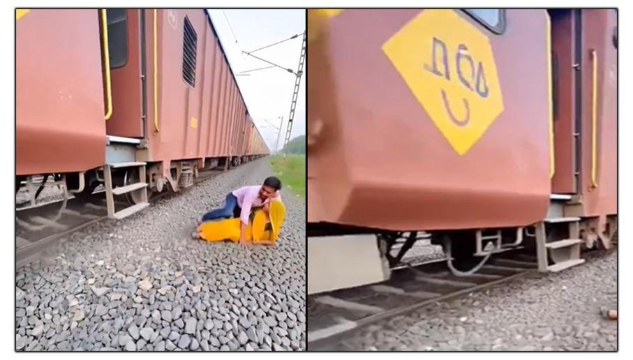 ভিডিওতে দেখা যাচ্ছে যে কীভাবে এক প্রেমিক যুগল মালগাড়ির নিচে ট্রেনলাইনে বসে প্রেম করছিল এবং ট্রেন চলা শুরু হলেই কোনও মতে পালিয়ে তারা প্রাণ বাঁচালো।