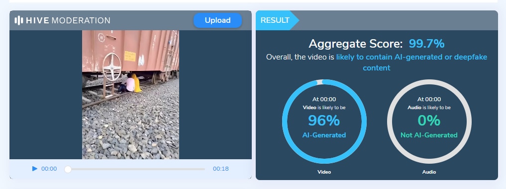 পুরোপুরি নিশ্চিত হতে ভিডিওটি এআই যাচাইকারী টুল হাইভ মডারেশনের মাধ্যমে পরীক্ষা করা হলে এই ভিডিওটিকে ৯৯.৭ শতাংশই এআই দ্বারা নির্মিত বলে ফলাফল দেখানো হয়।