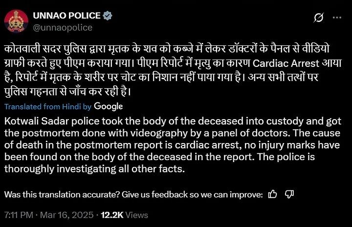 এই বিষয়ে ১৬ এপ্রিল দ্য কুইন্ট একটি খবর প্রকাশ করেছিল। যেখানে উন্নাও পুলিশের একটি বক্তব্য পাওয়া যায়। একটি এক্স পোস্টের মাধ্যমে উন্নাও পুলিশ দাবি করে যে, পোস্টমর্টেম বা ময়নাতদন্তে মৃত্যুর কারণ হিসেবে হার্ট অ্যাটাক বা হৃদযন্ত্র বিকল হওয়া উঠে এসেছে। শরীরে কোনও আঘাত পাওয়া যায়নি।