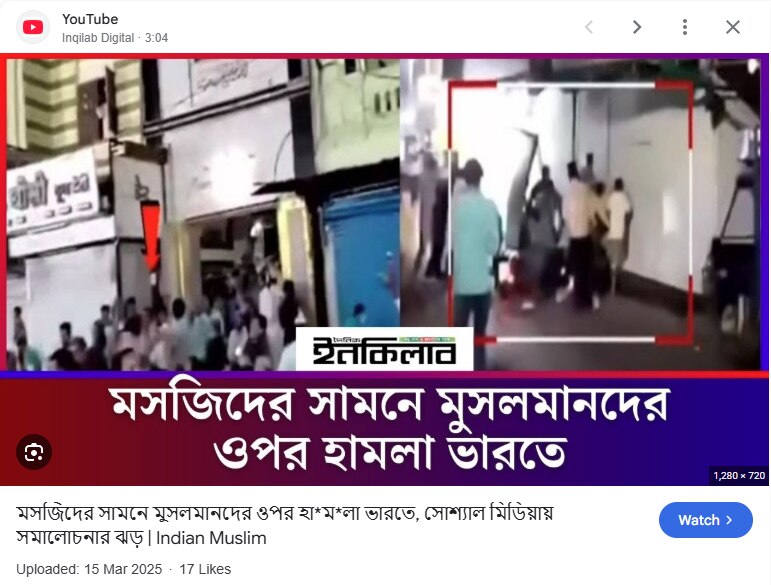 ২০২৫ সালের ১৫ মার্চ আপলোড হওয়া এই ভিডিওতে ভারতে নানা সময়ে মুসলিমদের উপর হামলার কথা তুলে ধরা হয়। যদিও প্রসঙ্গত উল্লেখ্য, এই প্রতিবেদনে যে ছবিগুলি ব্যবহার করা হয়েছিল তার মধ্যে একটি ছবি ছিল ২০২১ সালে আফগানিস্তানের মসজিদে হওয়া বিস্ফোরণের। এর সঙ্গে ভারতের কোনও সম্পর্ক নেই। আরও একটি উল্লেখযোগ্য বিষয়, ভাইরাল পোস্টে প্রথম ও দ্বিতীয় উভয় ছবিতে “ভারতে মসজিদ থেকে নামাজ পড়ে বের হওয়ার পর বাংলাদেশী রোগী নিহত” লাইনটি লেখা ছিল। কিন্তু আসল থাম্বনেলের ছবিতে এমন কোনও লাইন লেখা হয়নি।