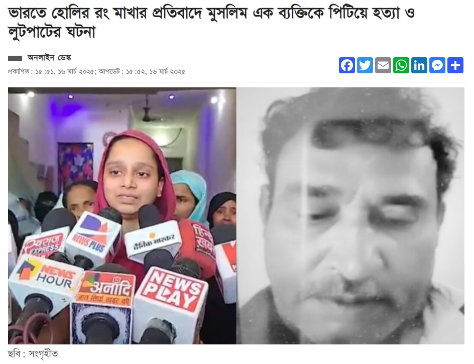 এই ধরনের কোনও ঘটনা ভারতে ঘটেনি। পোস্টের প্রথম ছবিটি ২০২৫ সালের মার্চে ডেইলি ইনকিলাবে প্রচারিত একটি ভিডিও-র। দ্বিতীয় ছবিটি উত্তর প্রদেশের উন্নাওয়ের যেখানে ২০২৫ সালের মার্চে হোলির সময় স্থানীয় বাসিন্দা শরীফের মৃত্যু হয়েছিল।