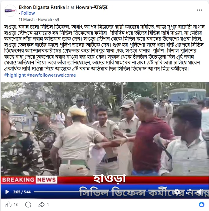 হাওড়া পুলিশের এক্স হ্যান্ডেলে দেওয়া বক্তব্যের সূত্র ধরে এরপর সিভিল ডিফেন্স এবং ডিজাস্টার ম্যানেজমেন্ট ফোর্সের সদস্যদের নবান্ন অভিযান সম্পর্কিত কিওয়ার্ড সার্চ করা হয়। তখন গত ১০ মার্চ এবিপি আনন্দের ইনস্টাগ্রাম হ্যান্ডেলে পোস্ট হওয়া ভিডিও পাওয়া যায়। সেই প্রতিবেদন অনুযায়ী, সিভিল ডিফেন্সের নবান্ন অভিযান ঘিরে ধুন্ধুমার পরিস্থিতি তৈরি হয় ধর্মতলায়। আন্দোলনকারীরা মুখ্যমন্ত্রী মমতা বন্দ্যোপাধ্যায়ের ধর্নামঞ্চের দিকে অগ্রসর হতে গেলে পুলিশি বাধার সম্মুখীন হয়।