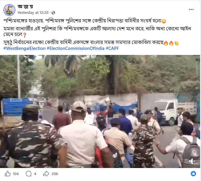 ভিডিও-র ক্যাপশনে লেখা হয়েছে, “পশ্চিমবঙ্গের হাওড়ায়, পশ্চিমবঙ্গ পুলিশের সঙ্গে কেন্দ্রীয় নিরাপত্তা বাহিনীর সংঘর্ষ হলো।মমতা ব্যানার্জীর এই পুলিশরা কি পশ্চিমবঙ্গকে একটি আলাদা দেশ মনে করে, নাকি অন্য কোনো আইন মেনে চলে? সুষ্ঠু নির্বাচনের লক্ষ্যে কেন্দ্রীয় বাহিনী একসঙ্গে বাংলার সমস্ত সমস্যার মোকাবিলা করছে।”