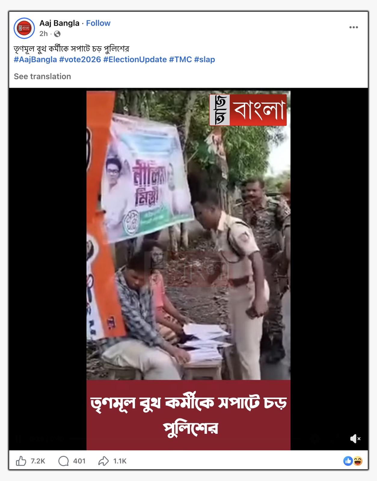 কোনও পেজ থেকে আবার এই একই ভিডিও পোস্ট করে ২০২৬ সালের নির্বাচনের হ্যাশট্যাগ ব্যবহার করে ২৩ এপ্রিল সকালে পোস্ট করে লেখা হয়েছে, “তৃণমূল বুথ কর্মীকে সপাটে চড় পুলিশের।”