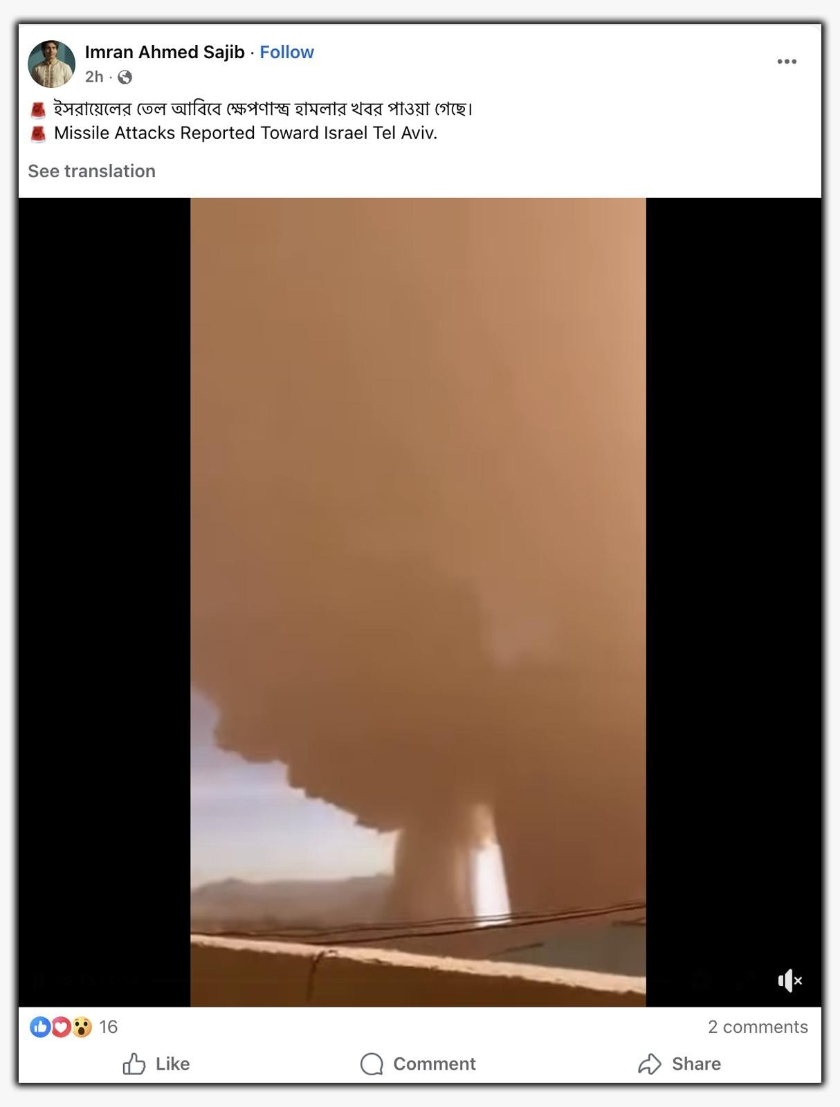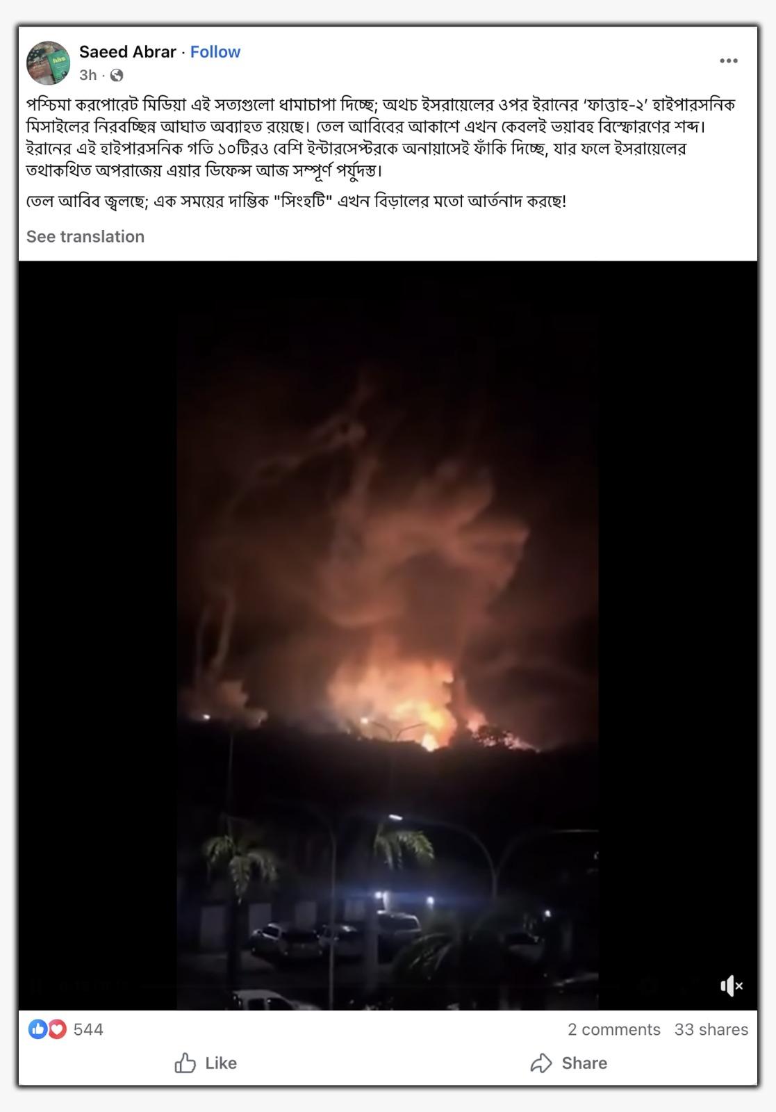 ভিডিওটি পোস্ট করে লেখা হয়েছে, “ইসরায়েলের তেল আবিবে ক্ষেপণাস্ত্র হামলার খবর পাওয়া গেছে।”