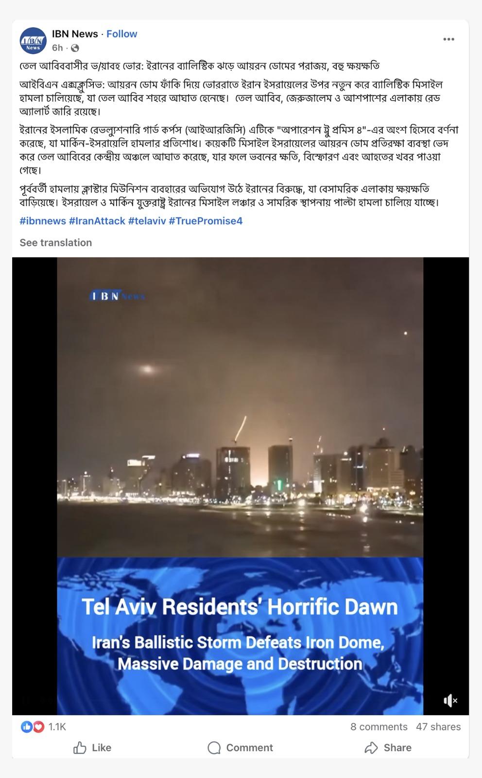 এই ভিডিওতে দূর থেকে বহুতলে ঘেরা একটি শহরে পরপর ক্ষেপণাস্ত্র আছড়ে পড়তে এবং বিস্ফোরণ হতে দেখা যাচ্ছে। ভিডিওটি পোস্ট করে লেখা হয়েছে, “তেল আবিববাসীর ভায়াবহ ভোর: ইরানের ব্যালিস্টিক ঝড়ে আয়রন ডোমের পরাজয়, বহু ক্ষয়ক্ষতি।”