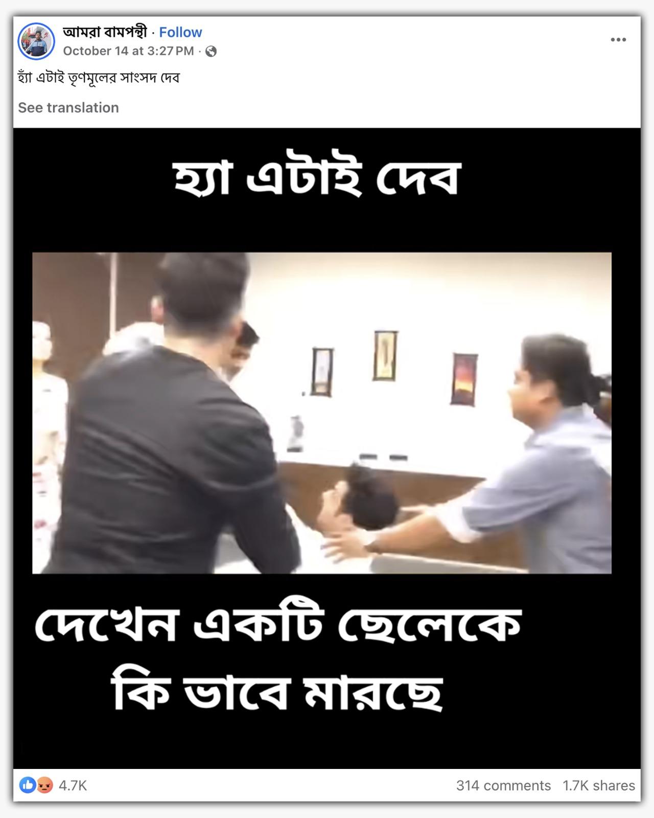 ভিডিওটি অনেকেই ফেসবুকে পোস্ট করে লিখেছেন, “হ্যাঁ এটাই তৃণমূলের সাংসদ দেব। দেখেন একটি ছেলেকে কি ভাবে মারছে।” (ক্যাপশনের বানান অপরিবর্তিত)