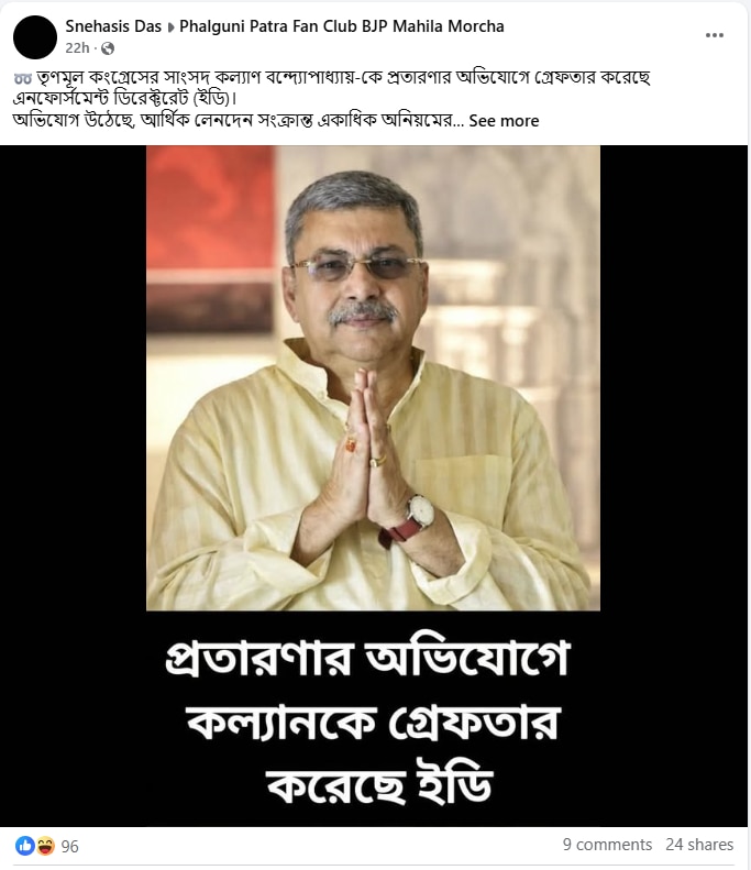 সম্প্রতি সোশ্যাল মিডিয়ায় একটি পোস্ট বেশ ভাইরাল হয়েছে। এই পোস্টে দাবি করা হচ্ছে যে তৃণমূল কংগ্রেসের শ্রীরামপুরের সাংসদ কল্যাণ বন্দ্যোপাধ্যায়কে গ্রেফতার করেছে ইফোর্সমেন্ট ডিরেক্টোরেট বা ইডি। এই পোস্টে শ্রীরামপুরের সাংসদ কল্যাণ বন্দ্যোপাধ্যায়ের ছবি রয়েছে। সঙ্গে লেখা হয়েছে, “প্রতারণার অভিযোগে কল্যানকে গ্রেফতার করেছে ইডি।”