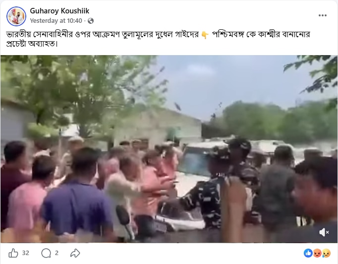 ভিডিওটি পোস্ট করে একে পশ্চিমবঙ্গের ভিডিও ঘটনা বলে দাবি করা হয়েছে। ক্যাপশনে কেউ কেউ লিখেছেন, “ভারতীয় সেনাবাহিনীর ওপর আক্রমণ তুলামূলের দুধেল গাইদের। পশ্চিমবঙ্গ কে কাশ্মীর বানানোর প্রচেষ্টা অব্যাহত।”