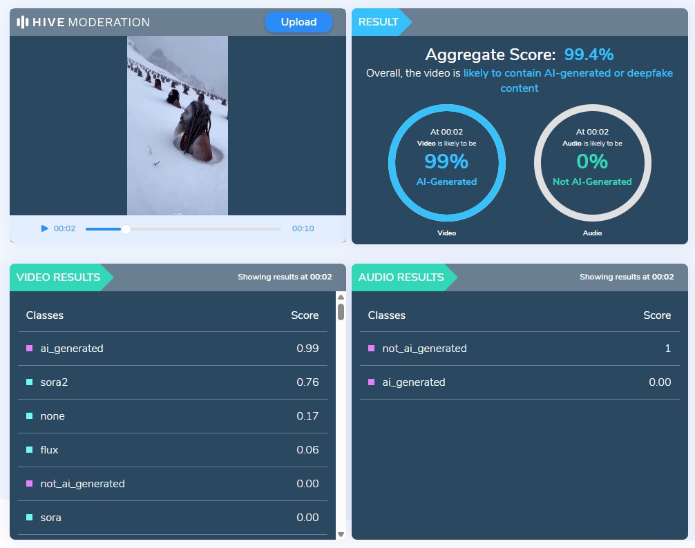 পরবর্তী সময়ে হাইভ মডারেশনের মতো এআই যাচাইকারী ওয়েবসাইটের মাধ্যমে ভিডিওটি পরীক্ষা করা হলে ফলাফল আসে, ভিডিওটি ৯৯ শতাংশের বেশি এআই দ্বারাই তৈরি।