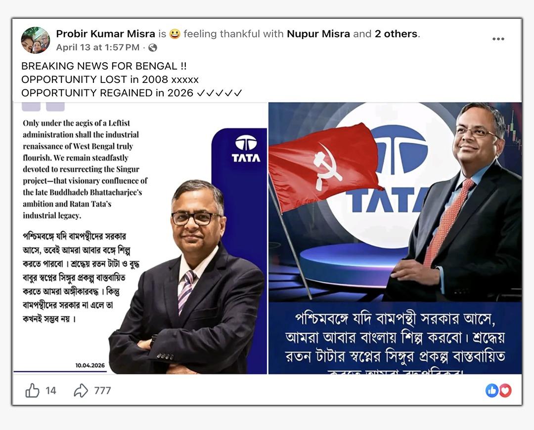 ভাইরাল হওয়া এই পোস্টে টাটা গোষ্ঠীর বর্তমান চেয়ারম্যান নটরাজন চন্দ্রশেখরনের একটি কথিত উক্তি ইংরেজি ও বাংলায় তুলে ধরা হয়েছে। পোস্টে ২০২৬ সালের ১০ এপ্রিলের তারিখ দিয়ে বাংলায় লেখা হয়েছে, “পশ্চিমবঙ্গে যদি বামপন্থীদের সরকার আসে, তবেই আমরা আবার বঙ্গে শিল্প করতে পারবো। শ্রদ্ধেয় রতন টাটা ও বুদ্ধ বাবুর স্বপ্নের সিঙ্গুর প্রকল্প বাস্তবায়িত করতে আমরা অঙ্গীকারবদ্ধ। কিন্তু বামপন্থীদের সরকার না এলে তা কখনই সম্ভব নয়।”
