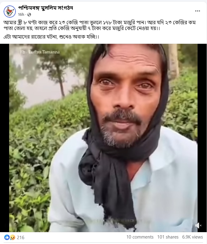 ভিডিওতে ভারতের তথা পশ্চিমবঙ্গের চা শ্রমিকদের দুর্দশা দেখা যাচ্ছে যারা সারাদিন কাজ করে ১৭৮ টাকা রোজগার করছেন।