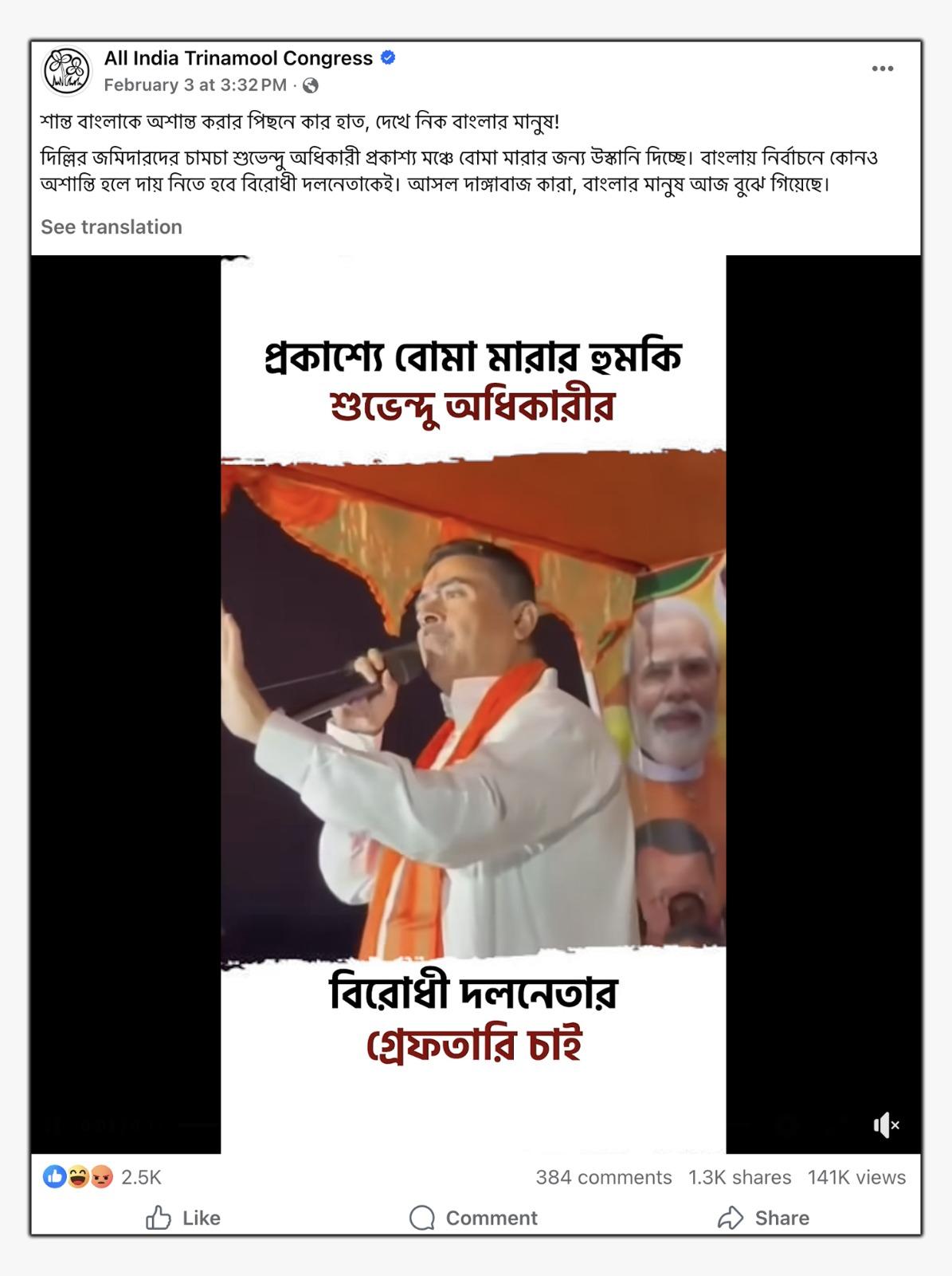 অর্থাৎ বোঝাই যাচ্ছে যে শুভেন্দু অধিকারীর একটি বক্তব্যের অংশবিশেষ ছড়িয়ে দাবি করা হচ্ছে যে তিনি বোমা মারার হুমকি দিয়েছিলেন। তবে বাস্তবে তিনি বলেন যে তৃণমূলের মডেল ভয় দেখানো ও বোমা মারা।