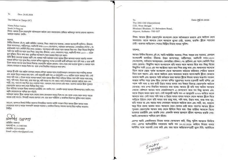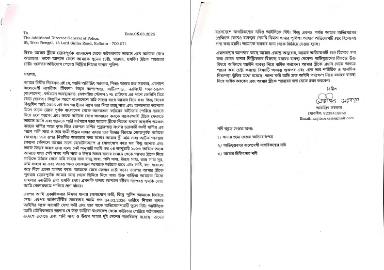 bangla.aajtak.in-এর সঙ্গে কথা বলতে গিয়ে পেশায় ব্যবসায়ী অরিজিৎ জানিয়েছেন যে তিনি ঢাকার নরসিংহ সদরের বাসিন্দা। তাঁর বাড়ির পাশেই থাকতেন মমি সাহা। দুবছর ধরে তাঁদের প্রেমের সম্পর্ক। কিন্তু মেয়ের বাড়ি প্রথম থেকেই এই সম্পর্ক মেনে নিতে পারেননি। ২০২৫ সালের সেপ্টেম্বরে পরিবারের অমতেই বিয়ে করেন অরিজিৎ ও মমি। কিন্তু বিয়ের কিছুদিন পরই অক্টোবর নাগাদ মেয়ের পরিবার তাঁকে জোর করে বাংলাদেশ থেকে আগরতলা বর্ডারের কাঁটাতর পেরিয়ে, অবৈধভাবে ভারতে নিয়ে আসে। অরিজিৎ বলেন যে তাঁর স্ত্রীকে বিরাটিতে পলি সাহা ও উত্তম সাহার বাড়িতে আটকে রাখা হয়। বাংলাদেশি যুবকের দাবি অনুযায়ী, তাঁর স্ত্রীর আত্মীয় (পলি ও উত্তম সাহা) বাংলাদেশের নাগরিক। অথচ তাঁরা ভারতের নাগরিকত্ব নিয়ে এখানে রয়েছেন। মমি সাহার ভারতে আসার ১৫ দিন পর অরিজিতের সঙ্গে হোয়াটসঅ্যাপে যোগাযোগ হয়। যুবকের স্ত্রী জানান যে তাঁকে তাঁর পরিবার আটকে রেখেছে।