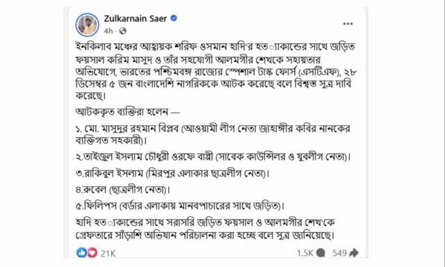 ইউরোপপ্রবাসী সাংবাদিক ও রাজনৈতিক কর্মী জুলকারনাইন সায়েরের দাবি ছিল, হাদি হত্যাকাণ্ডে জড়িত ফয়সাল করিম মাসুদ ও তার সহযোগী আলমগীর শেখকে পালাতে সহায়তার অভিযোগে ভারতে ৫ বাংলাদেশি নাগরিককে আটক করা হয়েছে। রবিবার (২৮ ডিসেম্বর) রাতে নিজের ফেসবুক অ্যাকাউন্ট থেকে করা পোস্টে তিনি জানান, ভারতের পশ্চিমবঙ্গ রাজ্যের স্পেশাল টাস্ক ফোর্স (এসটিএফ) ওই ৫ বাংলাদেশিকে আটক করেছে বলে বিশ্বস্ত সূত্রে জানা গেছে। তাঁর দাবি অনুযায়ী আটক ব্যক্তিরা হলেন- আওয়ামী লিগ নেতা জাহাঙ্গীর কবির নানকের ব্যক্তিগত সহকারী মো. মাসুদুর রহমান বিপ্লব, প্রাক্তন কাউন্সিলর ও যুবলিগ নেতা তাইজুল ইসলাম চৌধুরী ওরফে বাপ্পী, মিরপুরের ছাত্রলিগ নেতা রাকিবুল ইসলাম, ছাত্রলিগ নেতা রুবেল, বর্ডার এলাকায় মানবপাচারে জড়িত ফিলিপস।