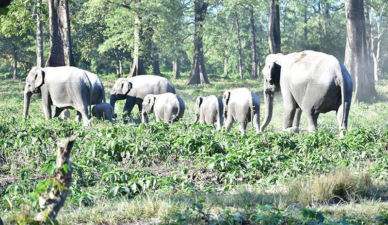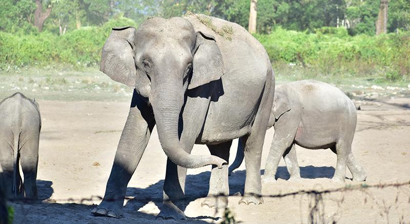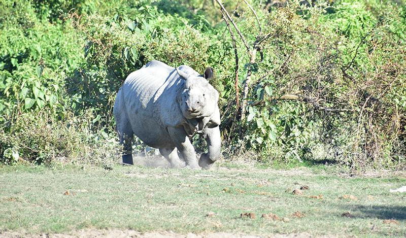 প্রায় কিলোমিটার খানেক গিয়ে একটা বড় ওয়াচটাওয়ার রয়েছে। তারই পাশে কিছু লবনের পিট করা আছে। সেখানেই পশুরা নুন চাটতে আসে। হাতির দল সেখানেই দেখা গেল। প্রায় ১৫টি হাতি এক সঙ্গে। তাদের মধ্যে সবচেয়ে ছোট সদস্যের বয়স মাত্র ৭ দিন। এর মধ্যেই পরিবারের সঙ্গে নিশ্চিন্তে জঙ্গল চষে ফেলছে সে। হাতি দেখার আনন্দে সকলে যখন আত্মহারা ঠিক সে সময় মঞ্চে প্রবেশ আরও এক জীবের। একটি পূর্ণ বয়স্ক পুরুষ গণ্ডার। সম্ভবত অন্য গণ্ডারের সঙ্গে মারামারি করতে গিয়ে তার সাধের খড়্গটি ভেঙে ফেলেছে।