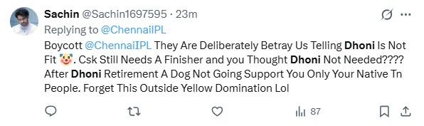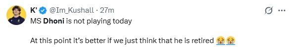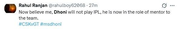 ধোনি সিএসকে-র অনুশীলন সেশনে অংশ নিচ্ছেন এবং ব্যাটিং কোচ মাইকেল হাসি বলেছেন যে প্রাক্তন ভারতীয় অধিনায়কের উন্নতি ভালোই হচ্ছে , তবে তারা চান তিনি যেন শতভাগ ফিট থাকেন। রবিবারের ম্যাচ শুরু হওয়ার আগে শোনা গিয়েছিল, টিম বাসে ছিলেন না ধোনি। সেই গুঞ্জন এবার সত্যি হল দল ঘোষনার পর। দেখা গেল প্রাথমিক দল তো বটেই, সাব লিস্টেও নেই মহেন্দ্র সিং ধোনির। জিটি-র বিরুদ্ধে ম্যাচের জন্য সিএসকে দলে মাত্র একটি পরিবর্তন এনেছিল, আর তা হলো উরভিল প্যাটেলের অন্তর্ভুক্তি এবং সরফরাজ খানের স্থান ইমপ্যাক্ট সাবস্টিটিউট বেঞ্চে।