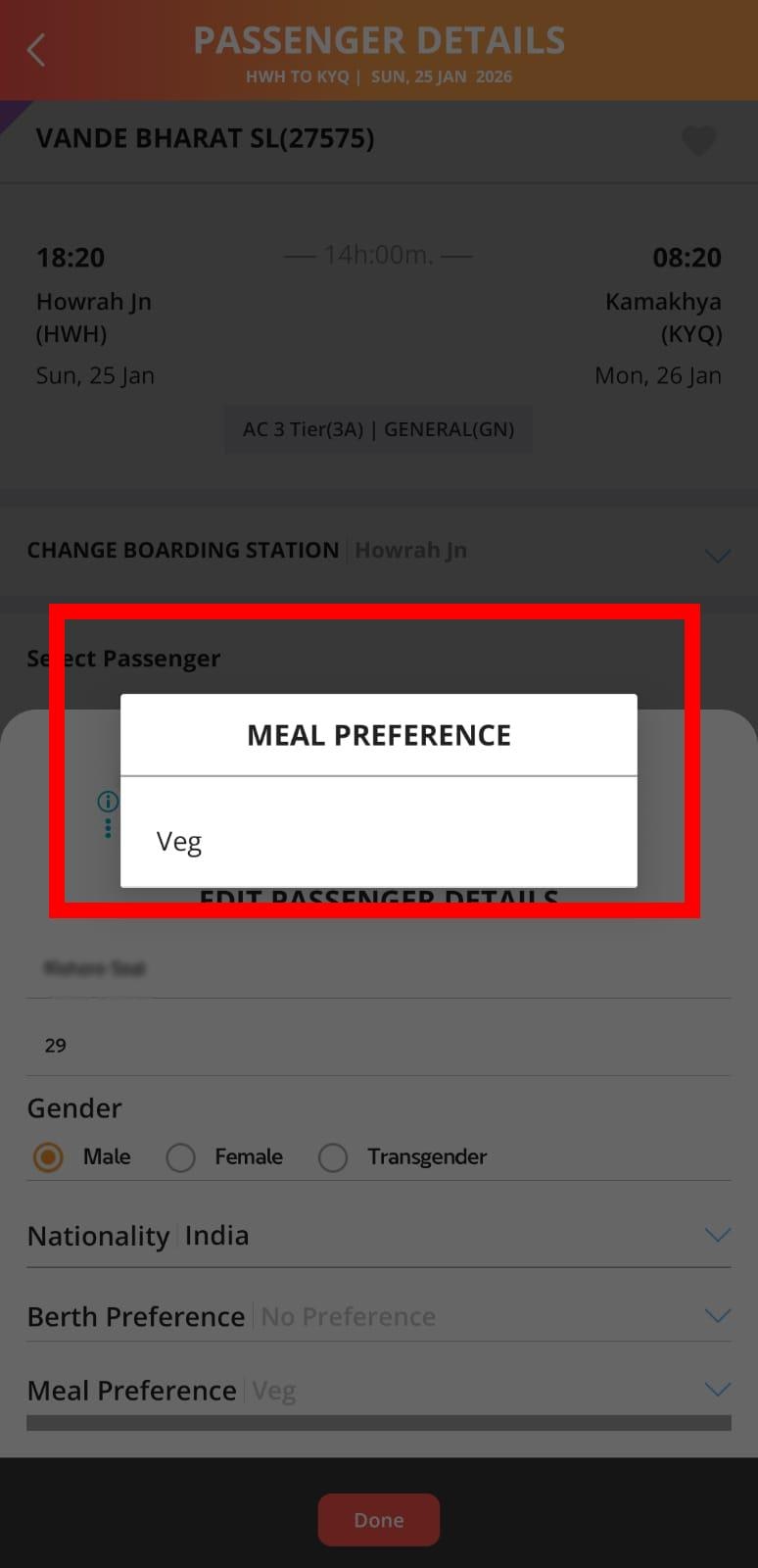 ট্রেনের টিকিট বুকিং করতে গিয়ে অনেক যাত্রীই অভিযোগ করছেন, রেলমন্ত্রী বাঙালি খাবারের কথা বললেও আপাতত এই ট্রেনে নন-ভেজ খাবারের অপশনই রাখা হয়নি। IRCTC অ্যাপ থেকে ট্রেনের টিকিট বুকিং করতে গিয়ে দেখা যাচ্ছে, সেখানে খাবারের অপশনে শুধুই ভেজ অপশনটি রয়েছে। এরপরেই প্রশ্ন উঠছে, তাহলে কি কামাখ্যাগামী এই ট্রেনে নন-ভেজ খাবার পাওয়া যাবে না?