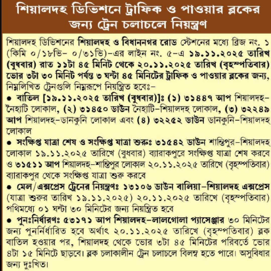 এই কাজের জন্য শিয়ালদা থেকে ৫৩১৭১ শিয়ালদা-লালগোলা লোকাল ৩০ মিনিট দেরিতে ছাড়বে। এটি ভোর ৩টে ৪৫ মিনিটের পরিবর্তে ৪টে ১৫ মিনিটে শিয়ালদা থেকে ছেড়ে যাবে।