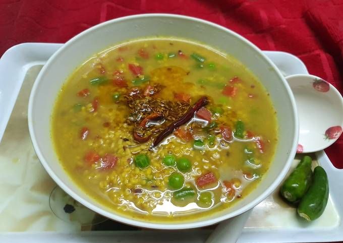 মুগ ডাল ভেজে সেদ্ধ করে নিন। এবার সাদা তেল ও ঘি গরম করে আদা বাটা, গোটা জিরে ও শুকনো লঙ্কা, কাঁচালঙ্কা ফোড়ন দিন। সামান্য চিনি দিলেই স্বাদ বাড়বে।