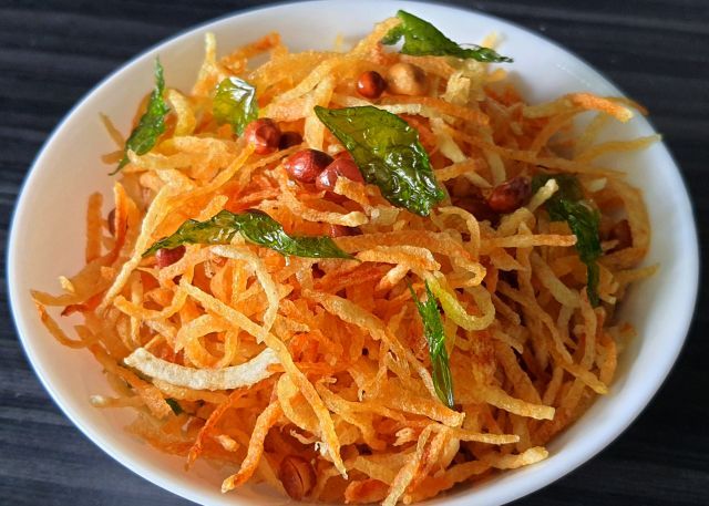 বিয়ের বাড়ি বা যে কোনও অনুষ্ঠান বাড়িতেই দেখে থাকবেন ঝুরঝুরে আলুভাজা সঙ্গে কারিপাতা ও বাদাম দিয়ে থাকে।