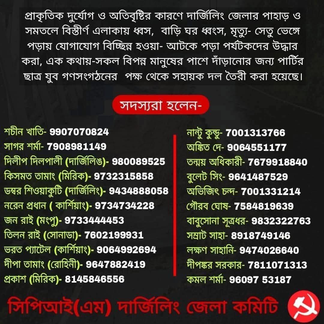 দুর্যোগে বিধ্বস্ত দার্জিলিঙে যে কোনও রকম সাহায্যের জন্য যোগাযোগ করতে পারেন পুলিশের সঙ্গে। এক্ষেত্রে ফোন করতে পারেন ৯১ ৯১৪৭৮ ৮৯০৭৮ নম্বরে। অথবা মেসেজ করে বা হোয়াটস অ্যাপ করেও সাহায্য চাইতে পারেন।