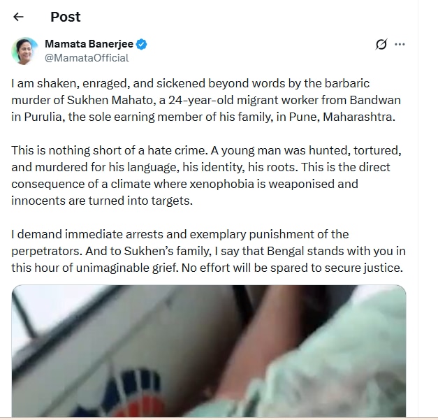 মুখ্যমন্ত্রী এদিন ভাষা, পরিচয় এবং নিজের শিকড়ের কারণে এক তরুণকে টার্গেট করে হত্যা করা হয়েছে বলে উল্লেখ করেছেন। তাঁর মতে, বিদ্বেষ ও বিদেশ ভীতিকে উস্কে দেওয়ার ফলেই নিরীহ মানুষ আক্রমণের শিকার হচ্ছেন। তিনি পোস্টে লিখেছেন, 'এই বর্বরোচিত হত্যাকাণ্ডে বাকরুদ্ধ, ক্ষুব্ধ এবং মর্মাহত। এমন এক সামাজিক আবহ তৈরি হয়েছ যেখানে ঘৃণাকে হাতিয়ার করা হচ্ছে এবং নিরপরাঘ মানুষকে নিশানা বানানো হচ্ছে।' একইসঙ্গে তিনি স্পষ্ট জানিয়েছেন, অপরাধীদের দ্রুত গ্রেফতার করে দৃষ্টান্তমূলক শাস্তি দিতে হবে। সুখেনের পরিবারের পাশে থাকারও আশ্বাস দিয়েছেন তিনি। ন্যায়বিচার নিশ্চিত করতে সবরকম প্রচেষ্টা করা হবে বলেও আশ্বাস দিয়েছেন মুখ্যমন্ত্রী।