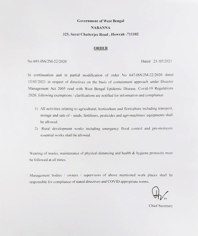 নবান্নের তরফে নির্দেশিকায় উল্লেখ করা হয়েছে, চাষের কাজ, উদ্যানপালনের কাজে ছাড় দেওয়া হচ্ছে। পাশাপাশি কৃষি সংক্রান্ত যন্ত্রাংশ, সার নিয়ে যাতায়াতের জন্য পরিবহণের ক্ষেত্রও ছাড়ের আওায় থাকবে। বন্যা ও বর্ষা মোকাবিলায় যাবতীয় কাজেও কোনও বাধা থাকবে না এই সময়ে। যদিও সমস্ত ক্ষেত্রেই মাস্ক, স্যানিটাইজার ব্যবহারের উপর ক্ষেত্রে কোনও ছাড় দেওয়া হচ্ছে না । ইতিমধ্যেই এই নির্দেশিকা পাঠানো হয়েছে রাজ্যের ২৩টি জেলাতেই।