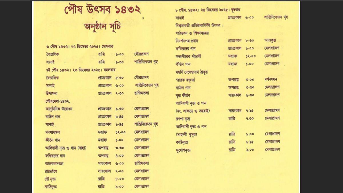 এদিন ছাতিমতলায় ব্রহ্ম উপাসনা, বৈদিক মন্ত্রপাঠ, রবীন্দ্রসঙ্গীতের মধ্যে দিয়ে সূচনা হয়েছে এই মেলার। উপাসনা অনুষ্ঠানে ছিলেন বিশ্বভারতীর উপাচার্য প্রবীরকুমার ঘোষ, অধিকর্তা অমিত হাজরা, অধ্যপক সুমন ভট্টাচার্য। আমন্ত্রিত অতিথি হিসাবে হাজির ছিলেন বীরভূম জেলা শাসক ধবল জৈন, জেলা পরিষদের সভাধিপতি কাজল শেখ। পাশাপাশি উপস্থিত ছিলেন বিশ্বভারতীর অধ্যাপক-অধ্যাপিকা, পড়ুয়া, আশ্রমিকেরাও।
