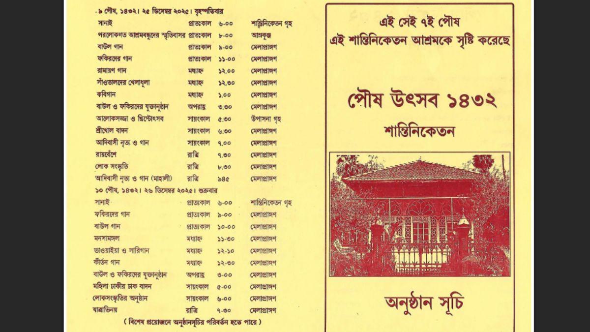 পৌষ মেলা ২০২৫বীরভূম জেলার বোলপুর শান্তিনিকেতনে শুরু হয়ে গেল পৌষমেলা। ২৩ ডিসেম্বর অর্থাৎ মঙ্গলবার থেকেই শুরু হল ১৮২ বছরের পুরনো পৌষমেলা। প্রথম দিনেই পৌষমেলায় দেখা গেল উপচে পড়া ভিড়। যা প্রমাণ করছে বাংলার লোকসংস্কৃতি, হস্তশিল্প এবং আধ্যাত্মিকতার এক অনন্য এই মিলনমেলার জনপ্রিয়তা এতটুকুও কমেনি।