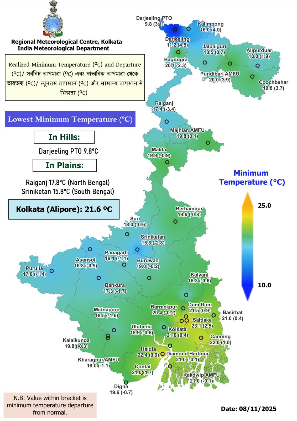 হাওয়া অফিস জানিয়েছে, দক্ষিণবঙ্গে শীত বাড়বে। কোথাও কোনও বৃষ্টির সম্ভাবনা নেই। কলকাতায় পতন হয়েছে দিনের সর্বোচ্চ তাপমাত্রারও। শনিবার দিনের গড় তাপমাত্রা কমে হয় ৩০.৬ ডিগ্রি সেলসিয়াস। শুক্রবার ছিল ৩১.১ ডিগ্রি সেলসিয়াসে। কলকাতা ও সংলগ্ন এলাকায় রবিবার সর্বোচ্চ ও সর্বনিম্ন তাপমাত্রা থাকতে পারে যথাক্রমে ৩০ ডিগ্রি সেলসিয়াস ও ২০ ডিগ্রি সেলসিয়াস। সোমবার রাতের মধ্যে কলকাতার তাপমাত্রা ১৯ ডিগ্রি সেলসিয়াসের নীচে নামতে পারে। বুধবারের মধ্যে তা নেমে ১৮ ডিগ্রি সেলসিয়াসে পৌঁছে যেতে পারে। বুধবার থেকে আগামী সপ্তাহ টানা কলকাতার সর্বনিম্ন তাপমাত্রা ১৮ ডিগ্রির আশপাশেই ঘোরাফেরা করবে।