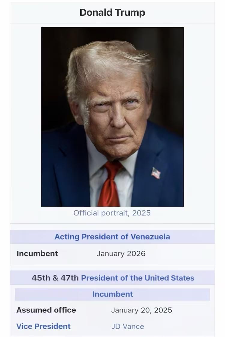 অন্তর্বর্তীকালীন প্রেসিডেন্ট হিসেবে চমক ট্রাম্পেরআগেই ট্রাম্প জানিয়েছিলেন, ভেনেজুয়েলাকে বছরের পর বছর শাসন করতে পারে আমেরিকা। আর এবার সেই ধাপে আরও একধাপ এগিয়ে নিজেকেই ভেনেজুয়েলার অন্তর্বর্তীকালীন প্রেসিডেন্ট হিসেবে ঘোষণা করলেন ডোনাল্ড ট্রাম্প। রবিবার মার্কিন প্রেসিডেন্ট সোশ্যাল মিডিয়া পোস্টে একটি ছবি দিয়ে নিজেকে ভেনেজুয়েলার 'ভারপ্রাপ্ত প্রেসিডেন্ট' হিসেবে ঘোষণা করেন।