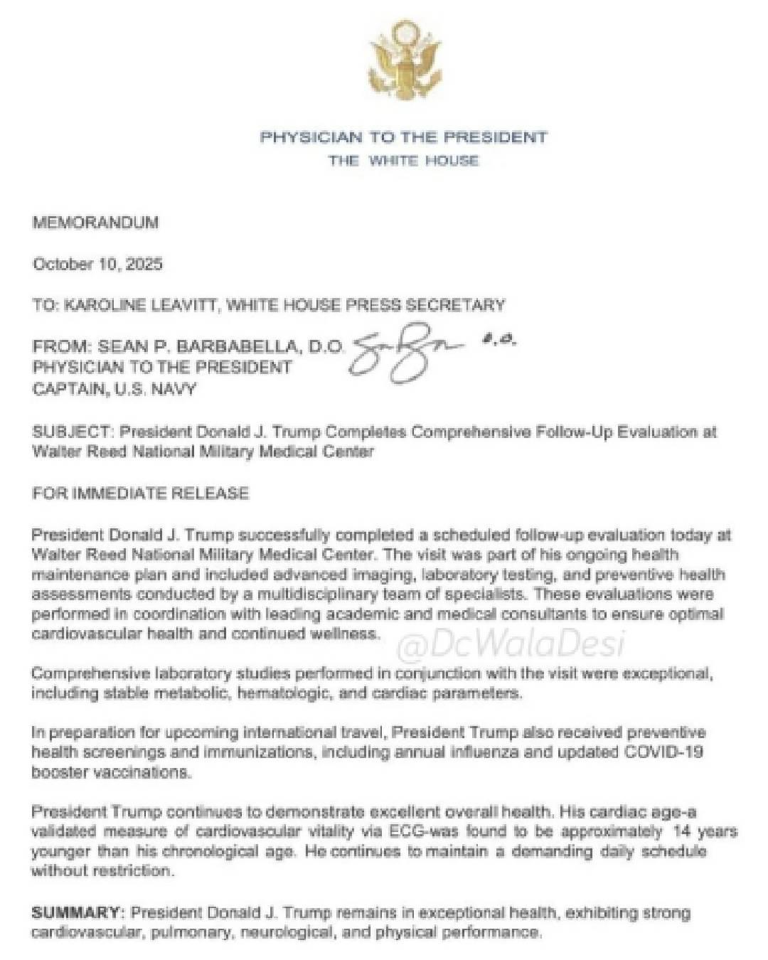 ডাঃ বারবেল্লা জানান, ট্রাম্পের পালমোনারি, নিউরোলজিক্যাল এবং শারীরিক সক্ষমতা 'এক্সিলেন্ট' পর্যায়ে রয়েছে। পাশাপাশি এই রিপোর্ট থেকে জানা যায় যে প্রেসিডেন্টের নিয়মিত হেলথ চেকআপ চলছে। তাঁকে দেওয়া হয়েছে বার্ষিক ফ্লু টিকা। এছাড়া আপডেটেড কোভিড ১৯ বুস্টারও পেয়েছেন তিনি।