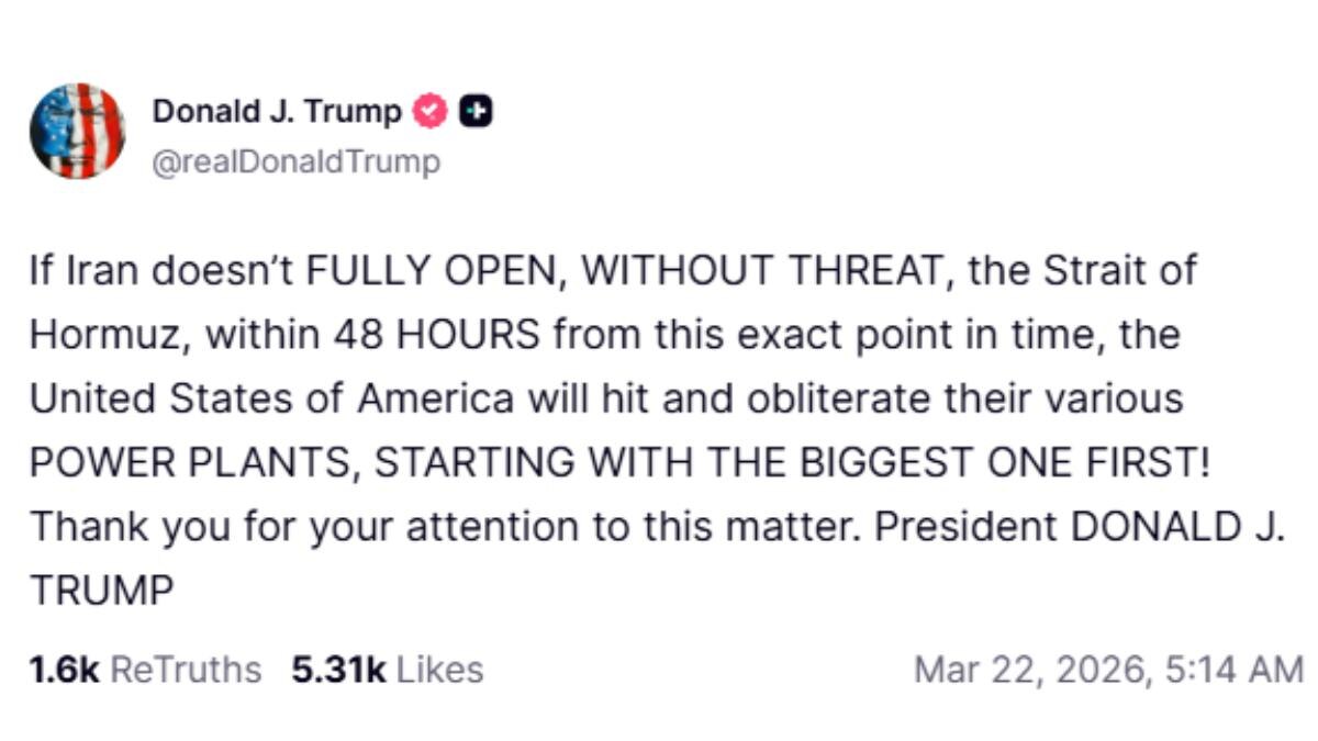 নিজের সোশ্যাল মিডিয়া প্ল্যাটফর্ম ট্রুথ-এ ট্রাম্প বলেন, "নির্দিষ্ট সময়ের মধ্যে যদি হরমুজ প্রণালী জাহাজ চলাচলের জন্য সম্পূর্ণভাবে খুলে না দেওয়া হয়, তবে ইরানের পাওয়ার প্ল্যান্টগুলিতে হামলা চালানো হবে। শুরুটা করা হবে সবচেয়ে বড় পাওয়ার প্ল্যান্ট দিয়েই।"