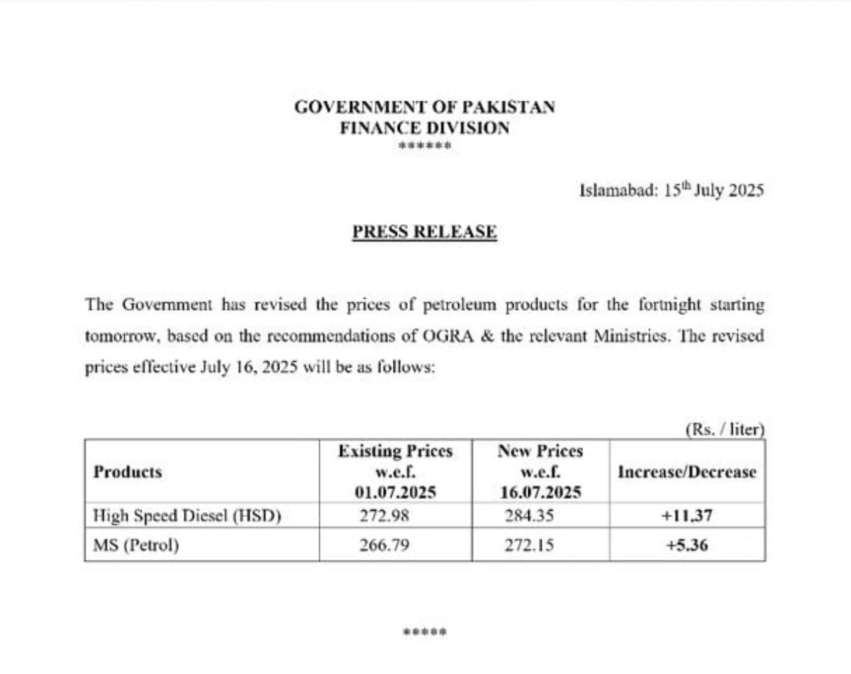 পাকিস্তানে পেট্রোল ও ডিজেলের দাম ক্রমাগত বৃদ্ধি পাচ্ছে এবং জুলাইয়ের শুরুতে, ১ জুলাই, ফেডারেল সরকার মাসের প্রথম দুই সপ্তাহের জন্য পেট্রোল ও ডিজেলের দাম উল্লেখযোগ্যভাবে বৃদ্ধি করে। এর পিছনে কারণ হিসেবে উল্লেখ করা হয় ১২ দিনের ইরান-ইজরায়েল সংঘাতের মধ্যে বিশ্ব বাজারে অপরিশোধিত তেলের দামে অস্থিরতা।