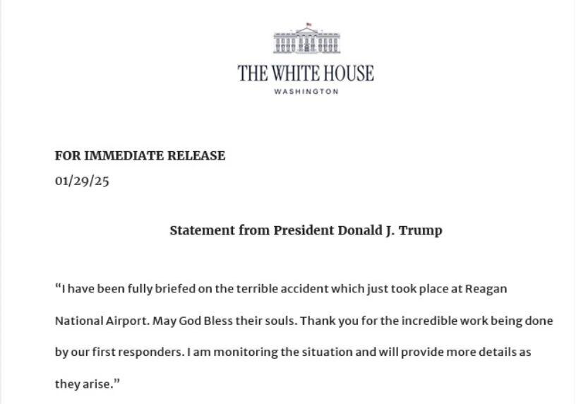 প্রেসিডেন্ট ডোনাল্ড ট্রাম্পকে এই দুর্ঘটনার কথা জানানো হয়েছে। হোয়াইট হাউস থেকে জারি করা এক বিবৃতিতে প্রেসিডেন্ট ট্রাম্প বলেছেন, রেগান জাতীয় বিমানবন্দরে ঘটে যাওয়া ভয়াবহ ঘটনার বিষয়ে তথ্য পাওয়া গেছে। ঈশ্বর নিহতদের আত্মার শান্তি দান করুন। আমি পরিস্থিতির উপর নজর রাখছি।
